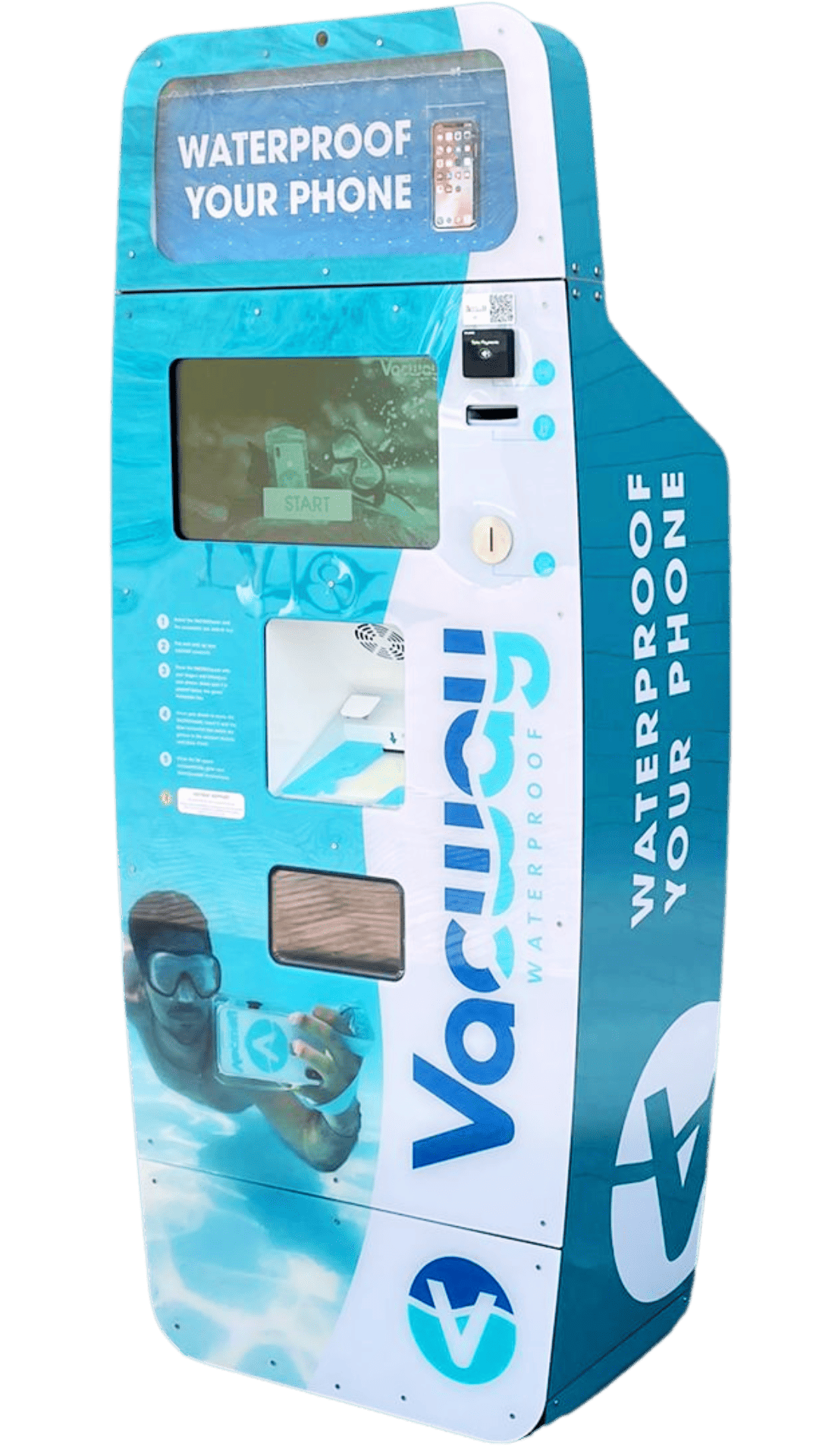 VACWAYONE is a smart vending machine that quickly and securely waterproofs smartphones, letting water park visitors enjoy rides and attractions worry-free. Compact, easy to use and compatible with all phone sizes, it offers fast protection on the go, keeping devices safe and guests stress-free.